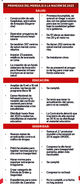 Por el lado económico, se filtró que la presidenta resaltará que la inflación en mayo cerró en 2 %, lo cual refleja una reducción de la tasa anual por segundo mes consecutivo. Sin embargo para el especialista Alejandro Indacoche, su mensaje será solo leer cifras y Boluarte se dedicará a resaltar ese “triunfalismo” por el rebote económico, que llevará al aumento de sueldo mínimo.