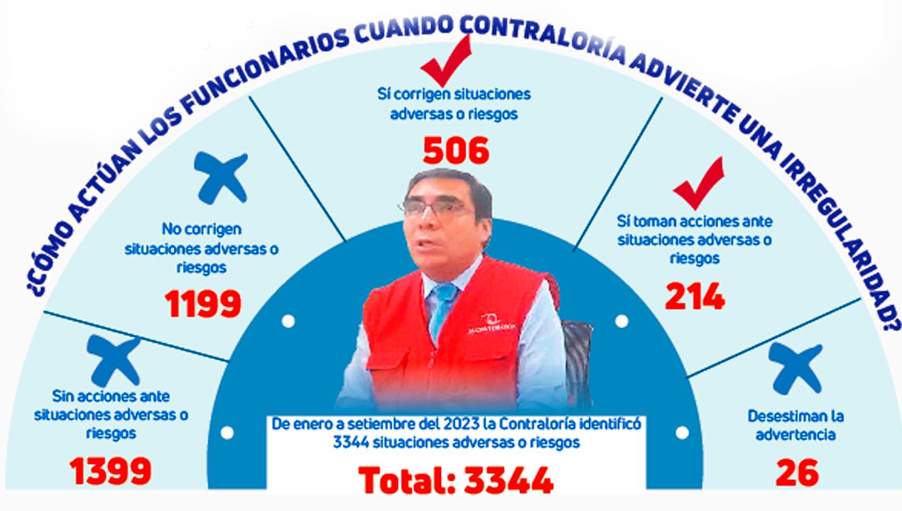 Arequipa. La Contraloría informó que solo 720  de las 3344 situaciones adversas, que identificaron en obras e instituciones de Arequipa, fueron corregidas o tomaron acciones. Es decir, los funcionarios y autoridades hicieron caso omiso a 2624 advertencias por el órgano contralor. Asimismo, informó que hasta la fecha hallaron un perjuicio de más de S/20 millones al Estado.