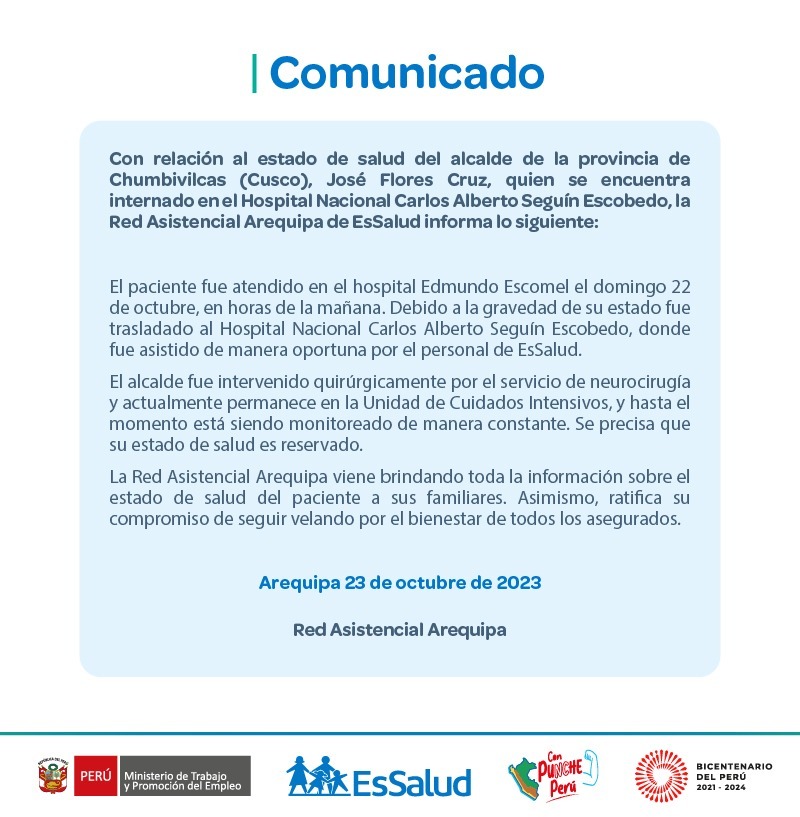 El alcalde de la provincia cusqueña de Chumbivilcas, José Flores Cruz, fue hallado en la Unidad de Cuidado Intensivos del hospital Edmundo Escomel de Essalud (Arequipa) luego que fue reportado como desaparecido desde el 21 de octubre, tras salir de una discoteca.