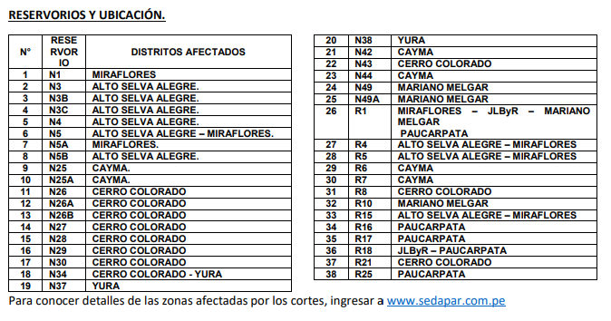 También se recomendó a los usuarios verificar en su recibo si su número de reservorio se encuentra incluido en el corte del servicio. Estos son los que se encuentran incluidos en la restricción.
