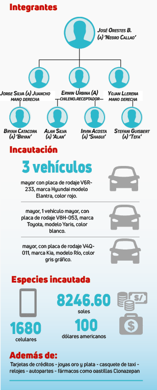 Tras 36 meses de investigación, la fiscal del Crimen Organizado, Alejandra  Cardena y la Policía lograron desarticular la organización criminal, que se dedicaba al robo agravado, falsos taxis y pepeo, provistos pastillas clonazepan y POS (máquina para lectura de tarjetas y realizar transacciones bancarias) que servía para despojr el dinero a sus víctimas.