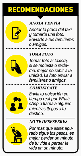La víctima puso la denuncia en la comisaría de José Luis Bustamante y Rivero. Esto revela que no hay seguridad ni en el aplicativo. Por ello diario Viral te da algunas recomendaciones antes de subir a un taxi y no seas parte de las cifras (ver cuadro).
