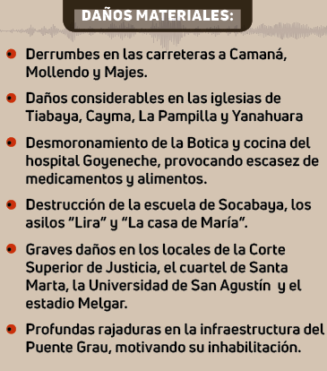 Apenas la tierra empezó a temblar todos los pobladores salieron presurosos de sus casas para ponerse a buen recaudo e implorar a Dios para que aplaque su ira, pasmados observaban como las antiguas casonas de sillar se desplomaban levantando intensa polvareda. En las faldas del Misti se generaron derrumbes, muy cerca al sector de Charcani, esto provocó que el servicio de electricidad se vea restringido por algunas horas, similar suceso ocurrió en el canal de Zamacola, viéndose afectado también el servicio de agua.