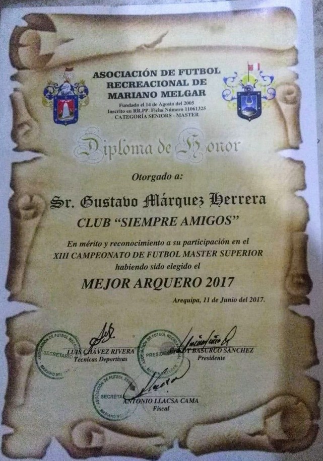 "Hoy a mis casi 66 años sigo en vigencia en el campeonato Edmundo Escomel del estadio de Israel dónde varias temporadas salí como mejor arquero atajando por la quinta Palabra. En la actualidad defiendo la camiseta del club más organizado de ASA (y quizá de Arequipa en categoría Master) el Regatas Alianza, dónde espero ganar más títulos".