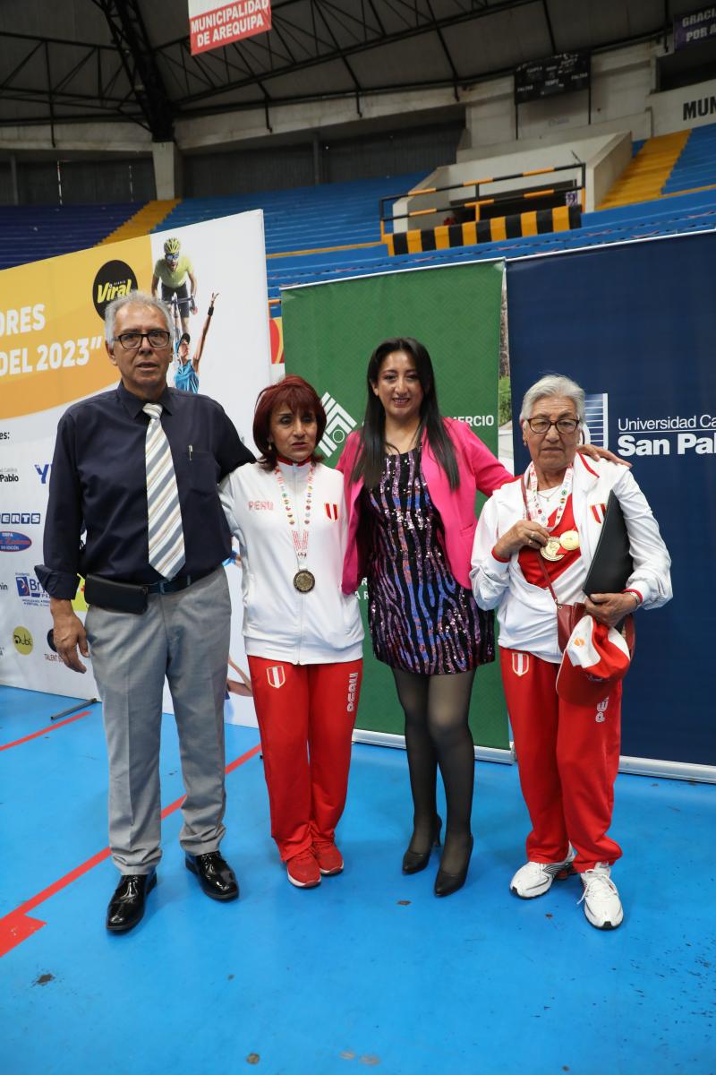 La presidenta de la Asociación de Atletas Senior de Arequipa, Carola Jaén Pacheco, estuvo reconocida por su aporte en traer medallas a la ciudad.