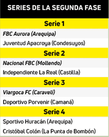 Mediante el sorteo de este martes en la reunión entre los delegados de los clubes clasificados y los miembros del directorio la Liga Departamental de Fútbol de Arequipa (Lidefa) se confeccionaron las cuatro series de la segunda fase de la etapa Departamental de la Copa Perú.