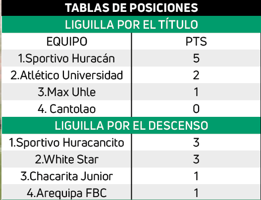 Respecto a la liguilla por la permanencia Huracancito derrotó 1-0 a Arequipa FBC y White Star igualó 1-1 ante Chacarita Junior. La próxima fecha será el sábado 18 de mayo desde las 8:20 horas. Chacarita Jr. vs. Arequipa FBC, Atlético Universidad vs. Cantolao y Sportivo Huracán vs. Max Uhle.