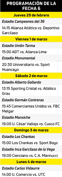 La sexta fecha del Torneo Apertura de la Liga 1, que se disputará desde el jueves 29 de febrero al lunes 4 de marzo, depara como plato fuerte la contienda entre dos de los líderes como Universitario y Sport Huancayo.