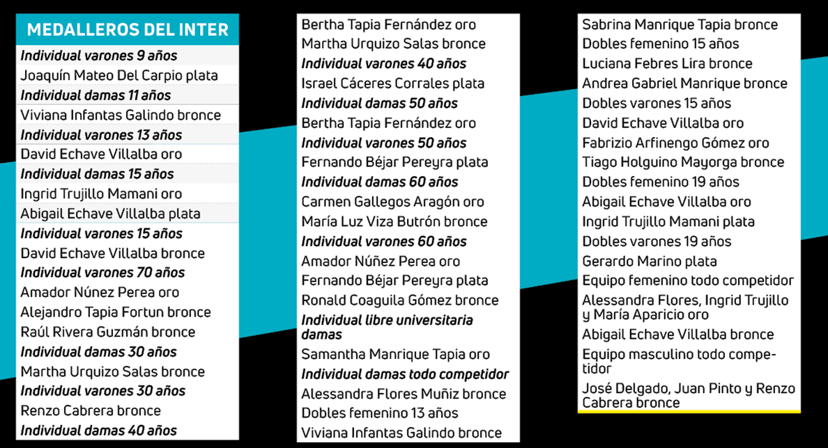Otra institución mistiana que destacó fue el club Tenis de Mesa AQP, que cosechó 29 preseas, 4 de oro, 7 de plata y 18 de bronce.