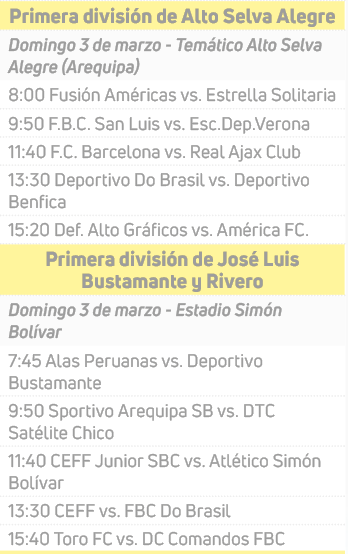La fiesta de la Copa Perú en la provincia de Arequipa romperá fuegos en su etapa distrital este domingo 3 de marzo. Son cuatro ligas de fútbol las que pondrán en marcha sus campeonatos de la primera división: Cayma, Mariano Melgar, Alto Selva Alegre y José Luis Bustamante y Rivero.