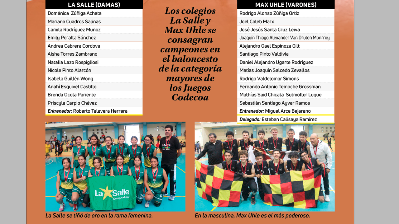 Los colegios La Salle, en damas, y Max Uhle, en varones se erigieron campeones en el básquet mayores de los Juegos Deportivos del Consorcio de Colegios Católicos de Arequipa (Codecoa) en esta temporada 2023.