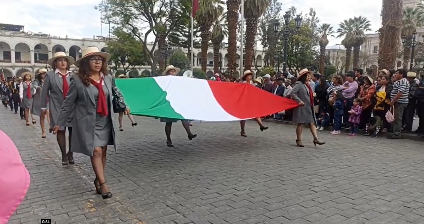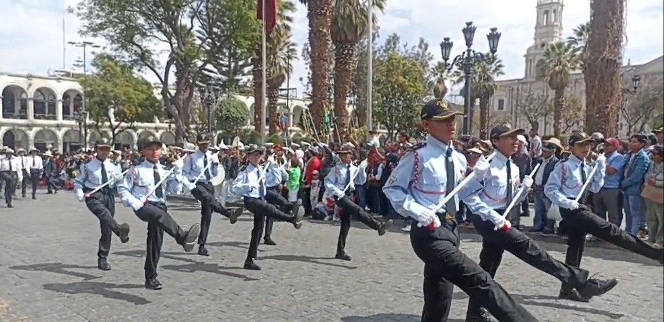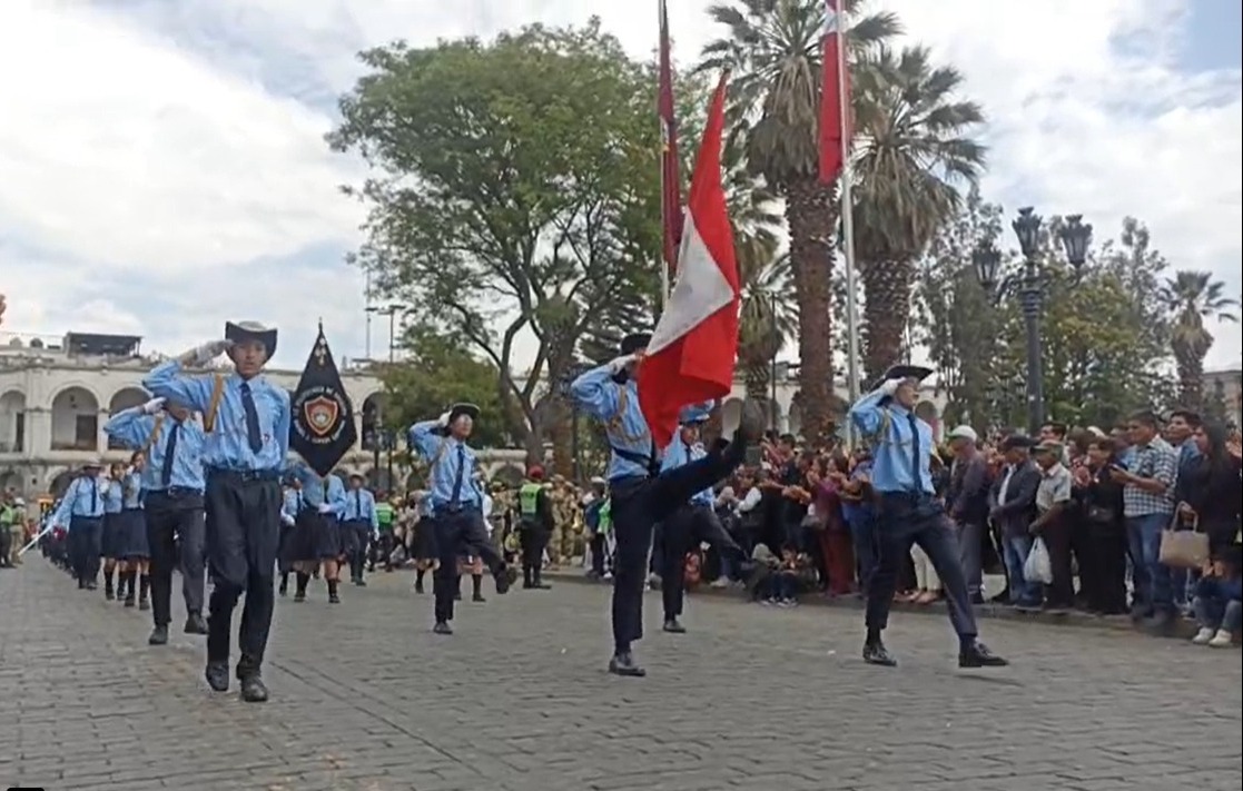 Es por ello que este domingo 1 de octubre del 2023, docentes, alumnos, personal administrativo, miembros de instituciones públicas y privadas, así como de periodistas de Arequipa desfilaron por el estrado oficialubicado frente a Portal de la Municipalidad Provincial de Arequipa en la plaza de Armas de la Ciudad Blanca, luego de haber realizado el izamiento del máximo símbolo patria: la bandera del Perú.