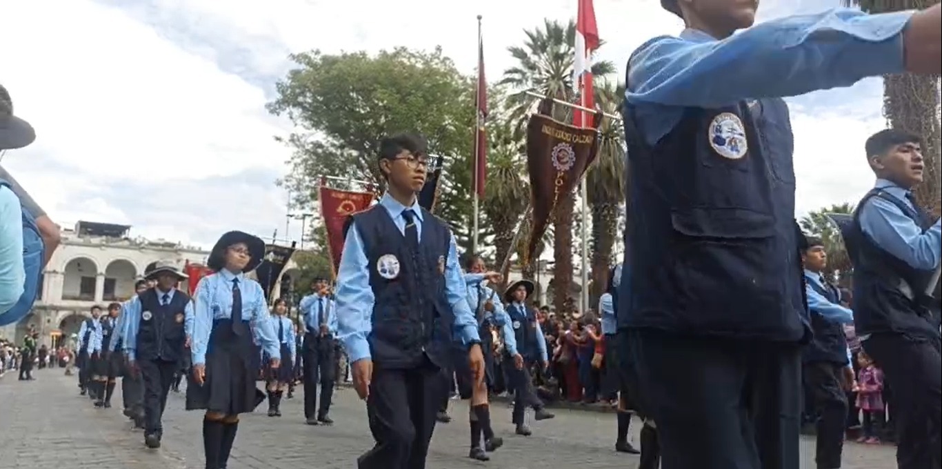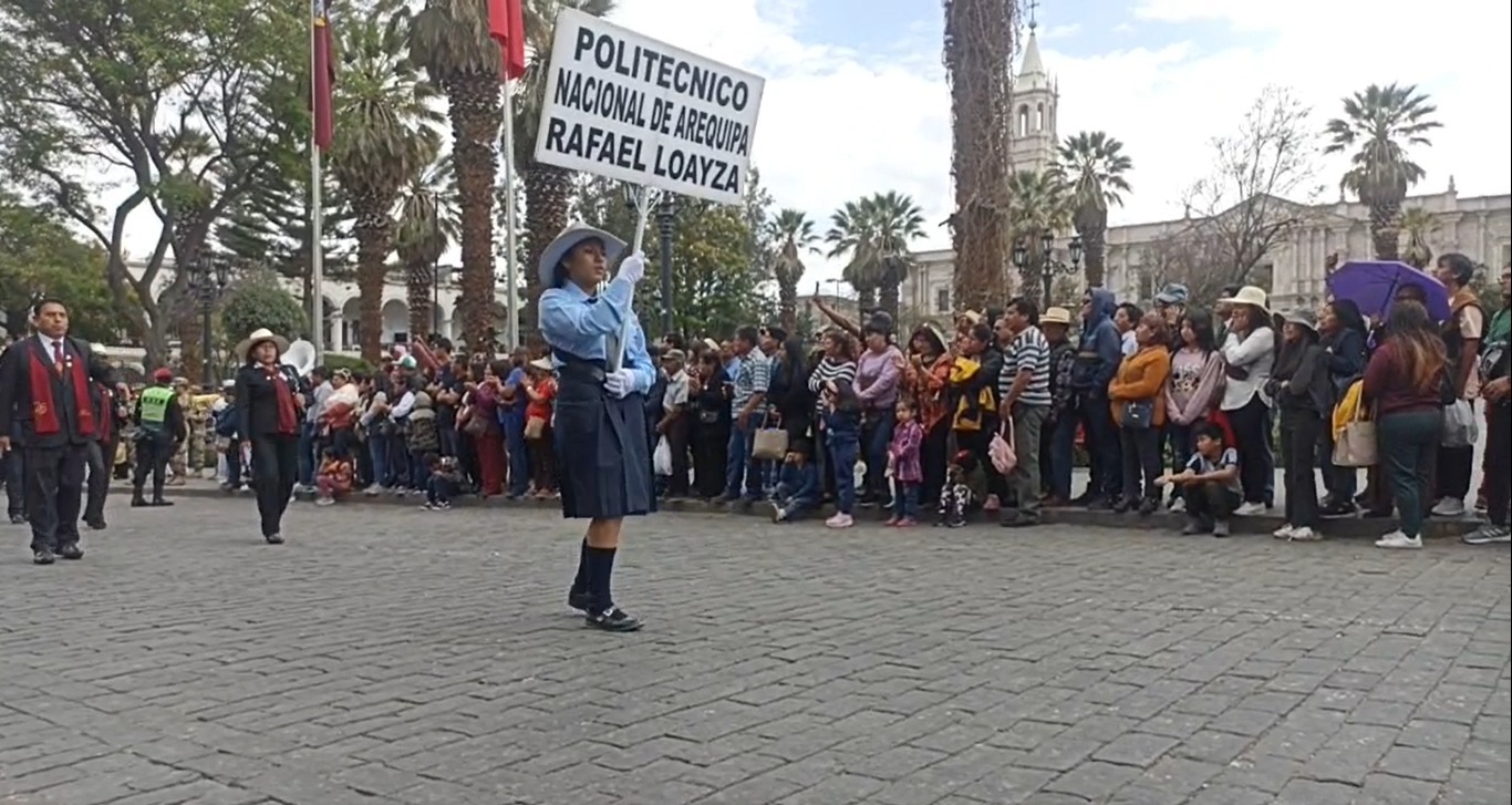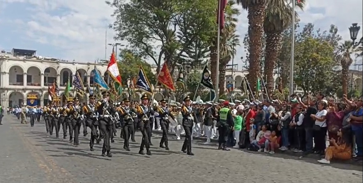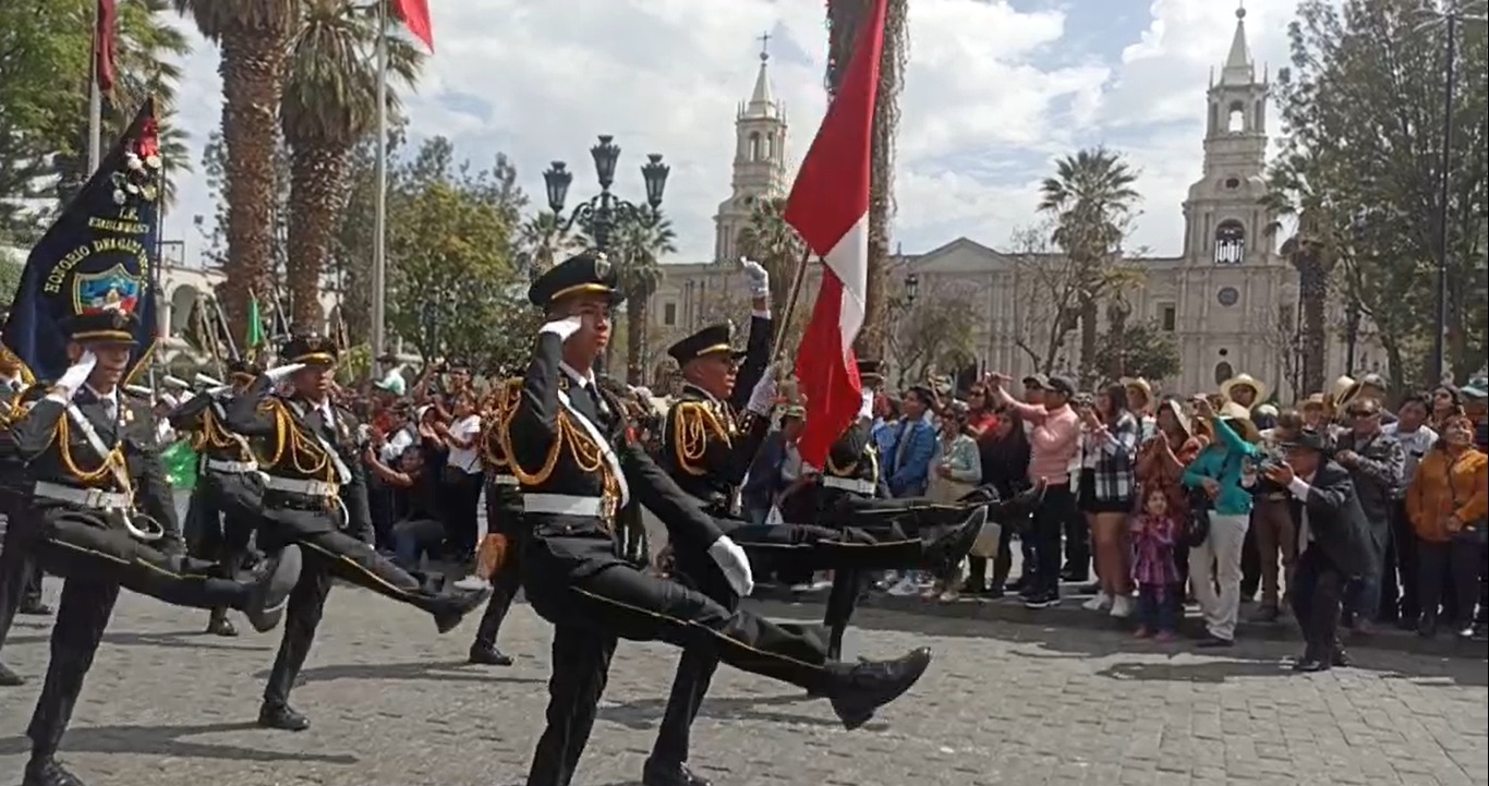 Es por ello que este domingo 1 de octubre del 2023, docentes, alumnos, personal administrativo, miembros de instituciones públicas y privadas, así como de periodistas de Arequipa desfilaron por el estrado oficialubicado frente a Portal de la Municipalidad Provincial de Arequipa en la plaza de Armas de la Ciudad Blanca, luego de haber realizado el izamiento del máximo símbolo patria: la bandera del Perú.