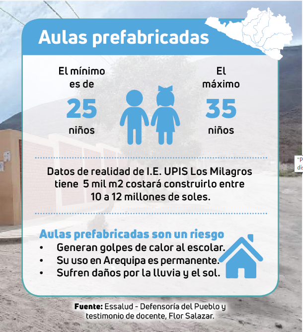 El colegio UPIS Los Milagros, ubicado en la zona 1 de la asociación del mismo nombre en el distrito de Yura lleva 9 años operando en aulas prefabricadas. Los docentes cuentan que estos salones son un horno en tiempo de calor y un refrigerador en temporada de frío. Pese a las adversidades, la educación no se detiene; los 220 niños merecen aprender, aunque agradecerían mucho si cambia su realidad con prontitud.