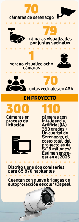 MÁS. Para el 2025, el burgomaestre, proyecta adquirir 117 cámaras de seguridad con inteligencia artificial (IA)  que se encuentra   con un  expediente de presupuesto de S/18 millones, junto a un cuartel de Serenazgo para capacitar al personal. Las   características de estos equipos visuales serán de una lente de 360 grados.