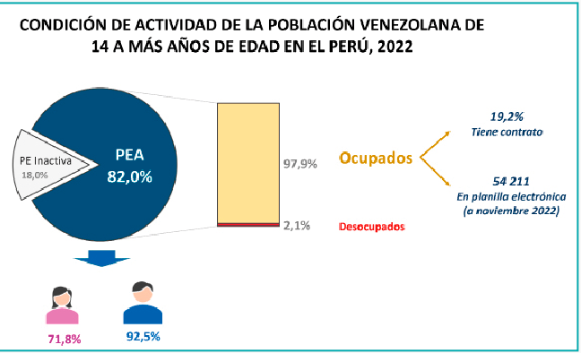 La población económica activa (PEA) de los ciudadanos venezolanos en el Perú es de 82 % de población que labora y la población económicamente inactiva es del 18 %. De estos porcentajes, el 71.8 % son mujeres extranjeras y varones son el 92.5 %. Del 97.9 % de ocupados, solo el 19. 2 % tiene contrato y el 2.1 % estuvieron en planilla electrónica hasta noviembre del 2022 (Ver cuadro).