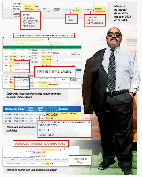 CUESTIONAMIENTOS. Ludwing Mendoza Paredes no sería solo un chofer más en la GREA, algunos trabajadores indicaron que también cumpliría labor de “guardaespalda”, ya que siempre se le ve junto a la funcionaria en actividades protocolares, asimismo es portador de un arma de fuego. Además, trascendió que este ya sería un conocido de la gerenta desde su extrabajo como directora del Colegio de Alto Rendimiento (COAR). También tiene una papeleta sin pagar G47 y registra en su antecedente policial que participó en 3 intervenciones: conducción en estado de ebriedad, choque y atropello.