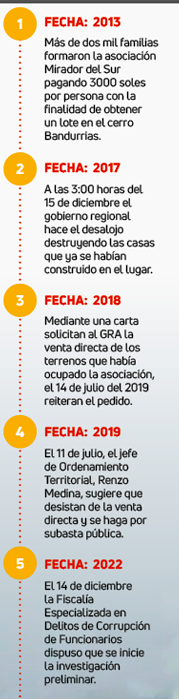 ANTECEDENTES. Todo comenzó en el año 2013 cuando las 2 mil familias llegaron a Alto La Punta con la esperanza de tener la casa propia, pero a diferencia de lo que la mayoría suele hacer cada uno de ellos hicieron un pago de S/3000 al entonces presidente de la asociación, Celso Rodríguez Ampuero y fue él quien los instaló en un área de 141 hectáreas en la zona conocida como cerro Bandurrias.