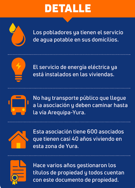 OTROS PROBLEMAS. Al igual que la mayoría de pueblos del Cono Norte, los vecinos no cuentan con el servicio de transporte público y deben caminar para llegar hasta la carretera Arequipa-Yura por donde circulan los buses del Sistema Integral de Transporte (SIT).
