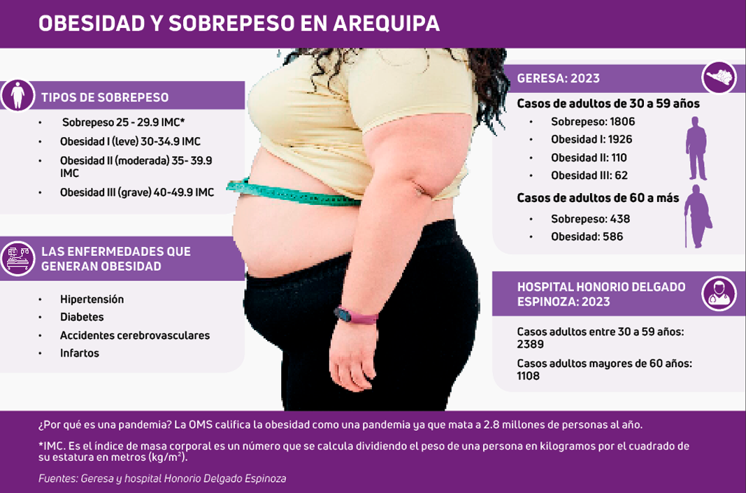 El último informe de la Gerencia Regional de Salud (Geresa) revela un alarmante número de casos de sobrepeso y obesidad en la región. Solo en enero de este año, se registraron 4928 casos, de los cuales 3904 lo padecen adultos de entre 30 y 59 años, a esta cifra se le suman 1024 casos son adultos mayores de 60 años. (Ver infografía)