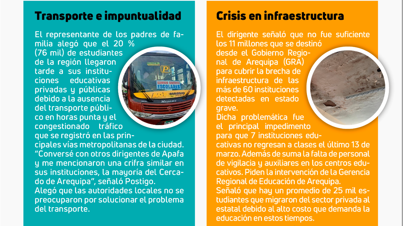 El presidente de la Asociación de Apafas de Arequipa, Rogelio Postigo, calificó como informal e improvisada la primera semana de clases de este año académico 2023. En un balance general se evidenció diferentes problemáticas que perjudican el buen retorno de los más de 380 mil estudiantes de Arequipa.