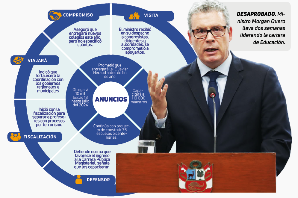 Morgan Quero pasó de ser la mano derecha como asesor de la presidenta Dina Boluarte, a liderar uno de los sectores más importantes del país: Ministerio de Educación (Minedu). El mencionado lleva 16 días como ministro y ya se reunió con congresistas, gobernadores, alcaldes y dirigentes sociales de sindicatos de educación. Estos últimos percibieron la inexperiencia de Quero y rechazan su designación.