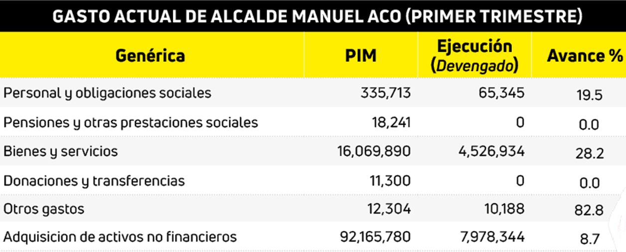 En el primer trimestre de gestión del alcalde, Manuel Aco Linares, no se evidencia grandes avances dentro de su jurisdicción y su participación en la mancomunidad. Su cortó porcentaje vaticina un gobierno similar al de su predecesor, José Álvarez Málaga, quien en su primer año de gestión (2019) solo logró gastar el 33.9 % de su presupuesto, pese a ello en los primeros tres meses devengaron S/ 9 894 901, cifra que superó por la mínima a Aco.