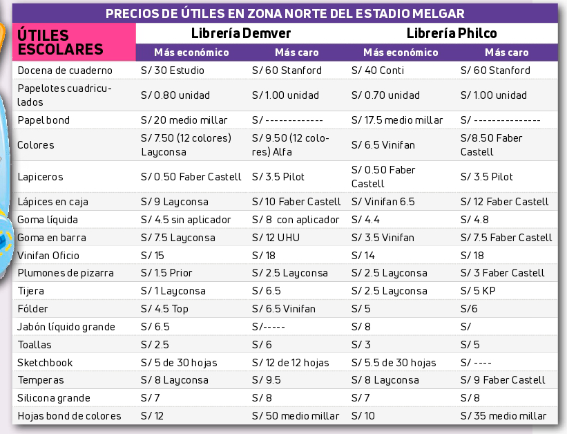 El coordinador de la feria escolar de la zona norte del estadio Melgar, Vidal Cuno, informó que los productos de colegio subieron en 30 %. Los comerciantes de los establecimientos afirmaron lo mismo y señalaron que el papel bond y los papelotes se elevaron en más de 10 soles.