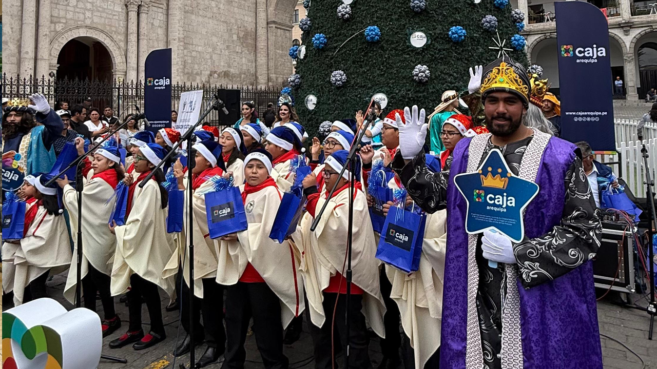 Posteriormente, los Reyes Magos se dirigieron al árbol de Navidad de Caja Arequipa, donde los pequeños congregados recibieron obsequios de los monarcas, reviviendo la tradición de su visita a Nazaret para entregar presentes al niño Jesús.