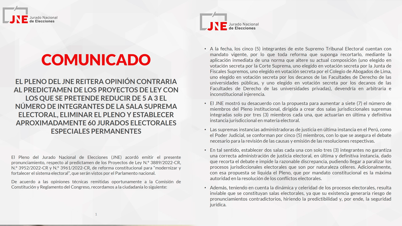 Una vez más el Jurado Nacional de Elecciones (JNE) ratificó su posición sobre las reformas sobre el sisteme electoral propuestas en el Congreso y que ahora se debatirá en la Comisión de Constitución del Congreso. El proyecto busca a reducir el número de integrantes de la sala suprema electoral, eliminar el pleno y establecer aproximadamente 60 jurados electorales especiales permanentes.