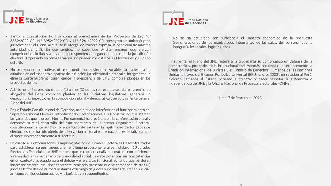 Asimismo, refiere que el JNE mostró su desacuerdo con la propuesta para aumentar a siete el número de miembros del pleno institucional, dirigida a crear dos salas jurisdiccionales supremas integradas por tres miembros cada una, que actuarían en última y definitiva instancia jurisdiccional en materia electoral.