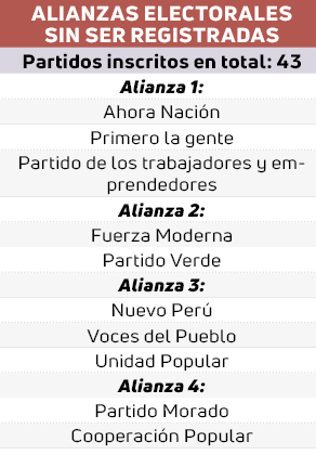 Sin embargo, al promediar las 17:35 horas, fue inscrita la alianza Unidad Nacional, integrada por tres partidos (Peruanos Unidos, Unidad y Paz y Partido Popular Cristiano-PPC). Pero, hay otras cuatro posibles alianzas que deben inscribirse este sábado (ver cuadro).