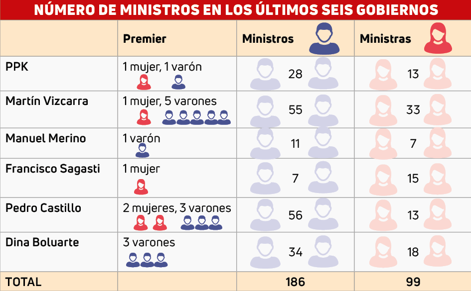 El expresidente Manuel Merino, en apenas cinco días de mandato logró juramentar a su gabinete que contó con 12 varones y 7 mujeres. El gobierno que contó con más representación femenina en las carteras fue del expresidente Martín Vizcarra quien juramentó 33 mujeres en sectores como Mujer, Salud, Producción.