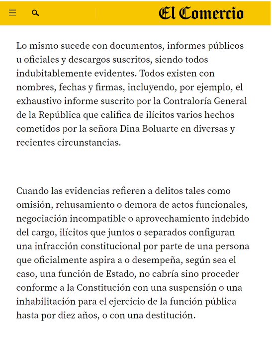 En uno de sus escritos indicó que la mandataria debía tener “una suspensión, inhabilitación para el ejercicio de la función pública hasta por diez años o una destitución”. Esto en consecuencia de “delitos tales como omisión, rehusamiento o demora de actos funcionales, negociación incompatible o aprovechamiento indebido del cargo, los cuales, juntos o separados configuran una infracción constitucional” (ver foto).