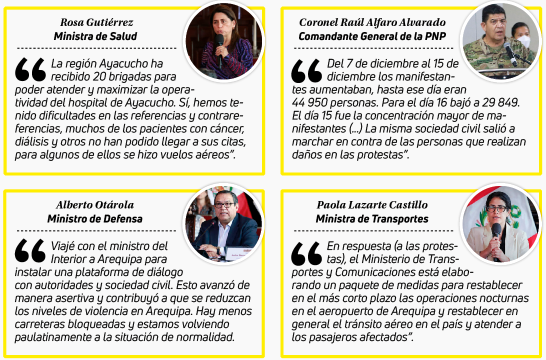 Por su parte el jefe del Sistema de Inteligencia, Rubén Castañeda, en su balance de los daños de las protestas, detalló que el 14 y 15 de diciembre ocurrieron cinco ataques a las comisarías, el 16 otro más y ayer no se reportó ninguno. En cuanto a las manifestaciones y concentraciones sociales, fueron 12 al inicio de las protestas, el 16 cinco y el 17 ninguno. Lo mismo ocurrió con el número de fallecidos: hubo 19 víctimas mortales entre el 14 y 15 de diciembre, el 16 uno y el 17 ninguno.