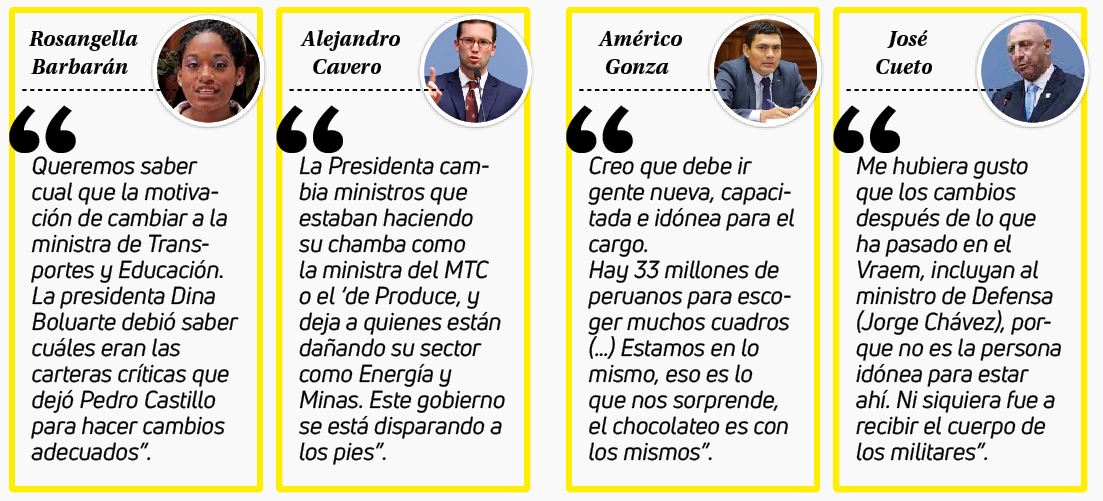 Las reacciones de los congresistas fueron críticas por la renuncia de Magnet Márquez y también por sacar a Paola Lazarte quien presidía Transportes. Desde Fuerza Popular, Renovación Popular, Perú Libre y parte de Alianza para el Progreso, indicaron que debieron cambiar al ministro del Interior, Vicente Romero y el de Defensa, Jorge Chávez Cresta.