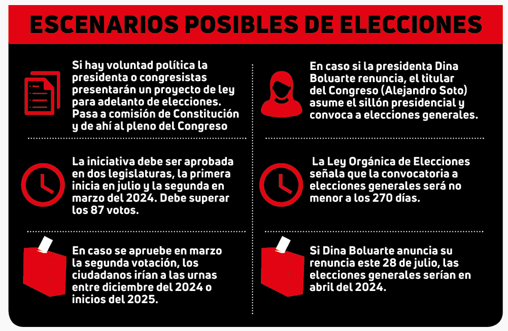 En las protestas, el pedido es adelanto de elecciones, en caso se presente un proyecto de ley y el Congreso lo apruebe, los comicios generales serían para finales del 2024 o inicios del 2025, explicó el experto electoral Jorge Mamani. En caso de que renuncie Boluarte, se podría dar en menos tiempo, según la ley, en nueve meses.  Sheput señala que la respuesta está en manos de Boluarte porque los parlamentarios no quieren irse.