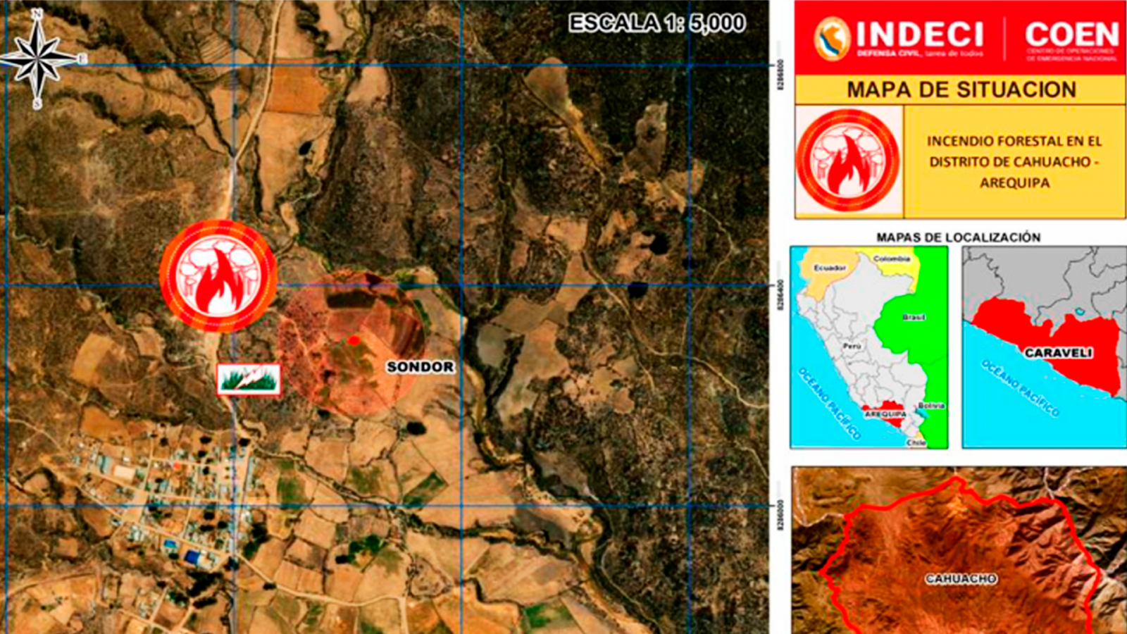 Caravelí. “Hemos agotado el material logístico que teníamos y el fuego está avanzando hacia los límites con Puyocuyusca, en la vecina provincia de Parinacochas, región de Ayacucho”, manifestó el alcalde provincial de Caravelí, Roberto Soto Riveros, sobre el incendio forestal del sector de Sóndor —distrito de Cahuacho, provincia de Caravelí— que por más de 17 días consumió cerca de 1000 hectáreas de pastizales donde muere fauna y flota.